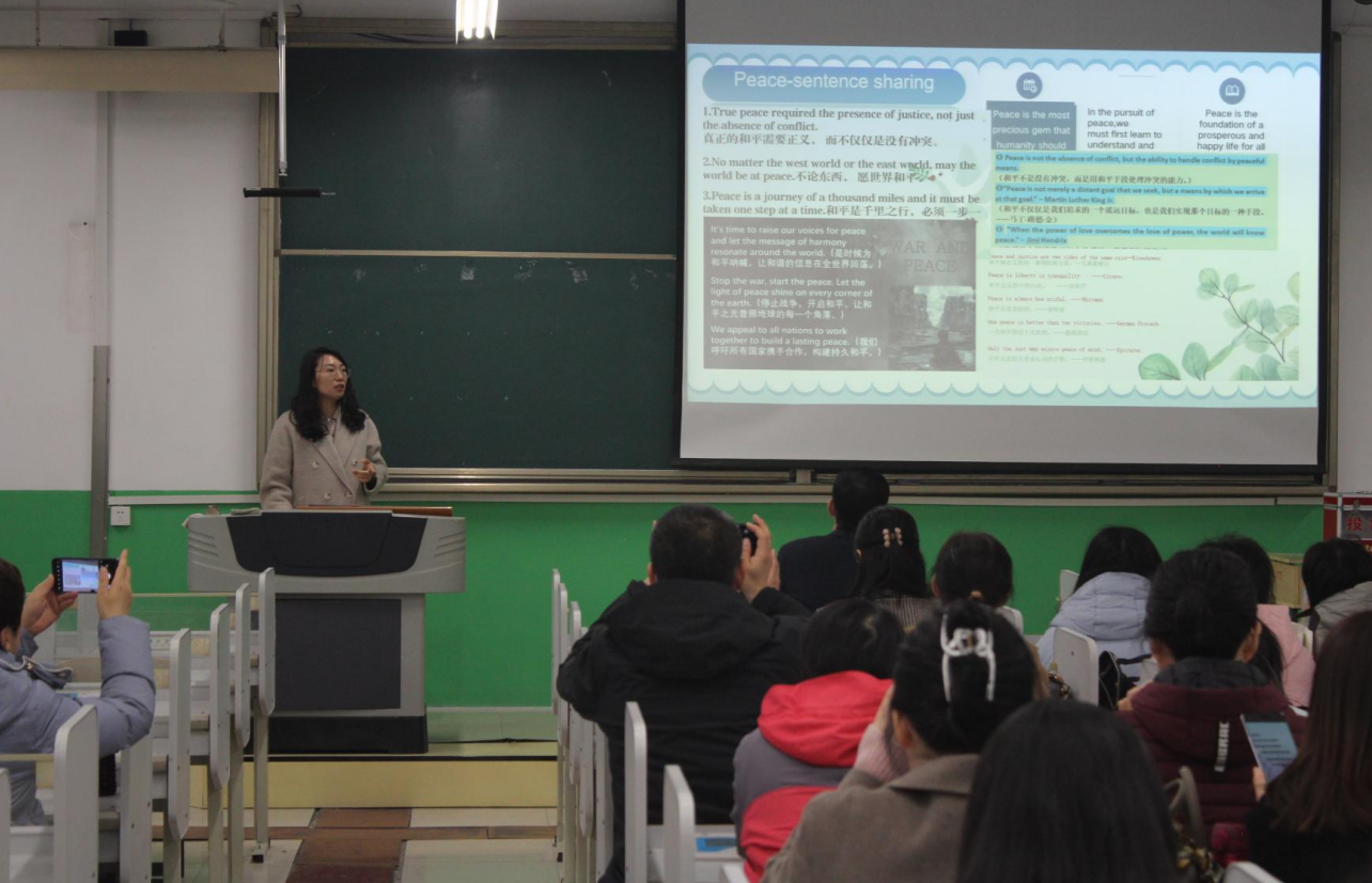 3月27日,我院教师工作坊举办和平学课程思政示范课活动。此次活动聚焦“外语课程思政新探索:讲优美和善的话语,创友好和平的世界”主题,学院党委书记戴敏、院长张学祥、副院长王珂及全体教师参加活动。